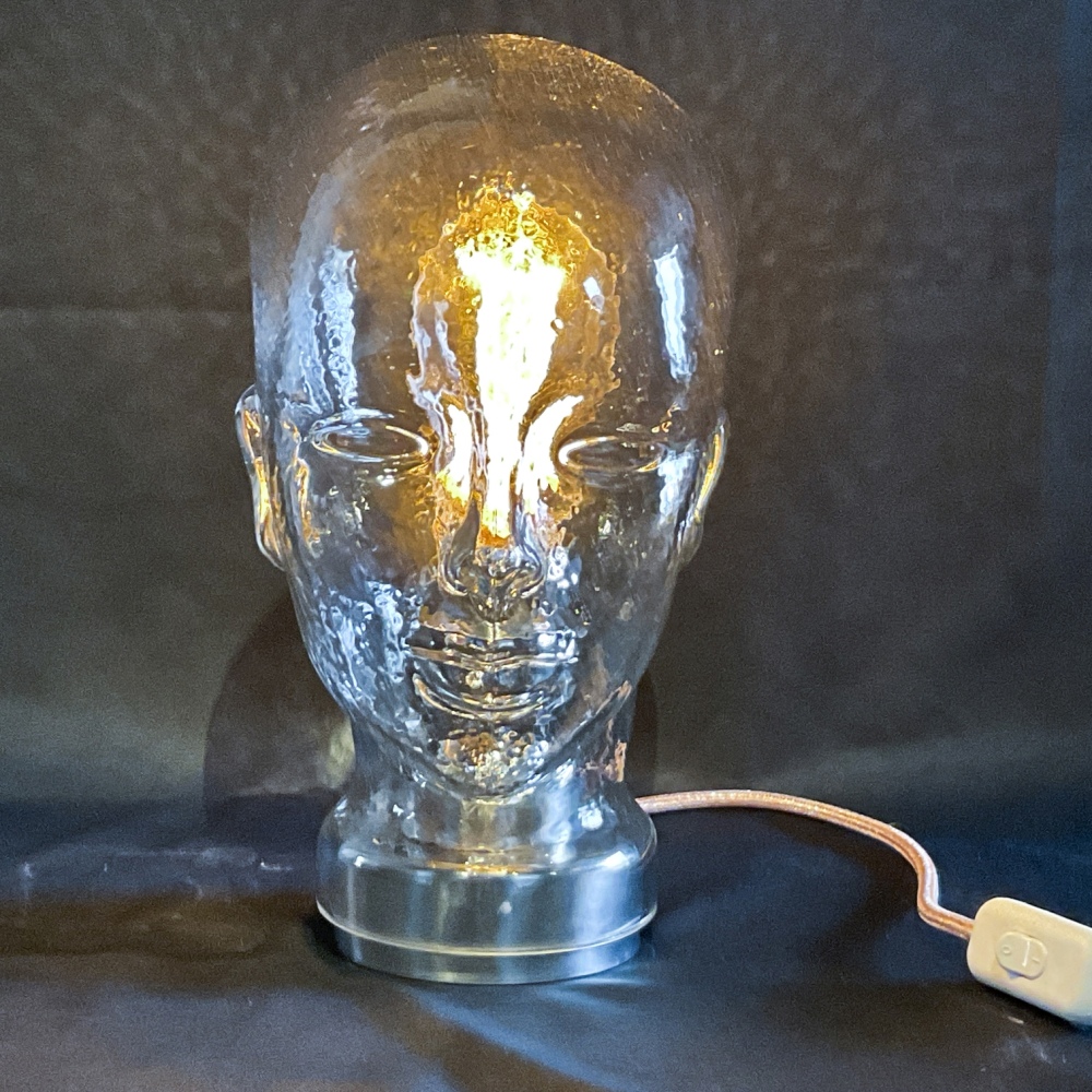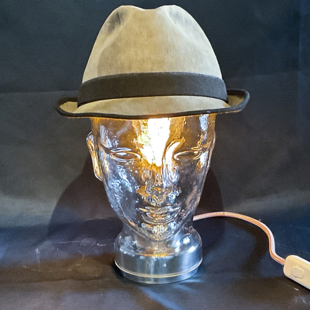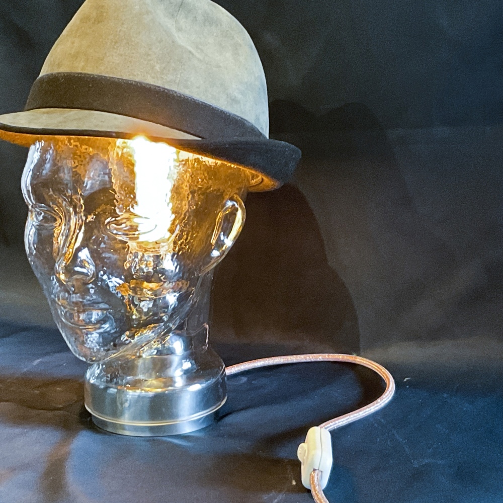 Glaskopf mit Hut, kombiniert mit Metallsockel und Spezial-LED-Glühbirne. Metallfassung E27 mit Serviettenringen kaschiert, Höhe 31 cm. Knipsschalter zum Ein-/Ausschalten, Stoffkabel 3adrig silber métallisé, Kabellänge 160 cm, mit 3pol-Stecker.